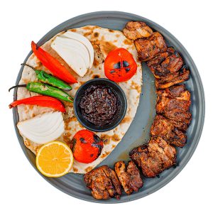 1 سیخ 250 گرمی گوشت مخلوط گوسفند و گوساله همراه با گوجه ، لیمو ، سبزیجات کبابی و سس ریحان