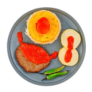 350 گرم فیله مرغ مزه دارشده با ماست و ادویه همراه با گوجه، لیمو، سبزیجات کبابی و سس ناردونی